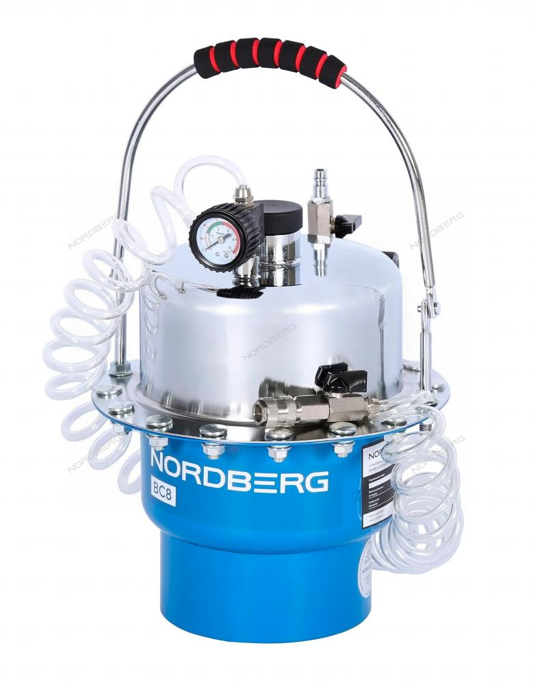 NORDBERG BC8 — Предназначена для быстрой и эффективной замены и прокачки тормозной жидкости без необходимости многократного нажатия на педаль тормоза. Использует сжатый воздух для создания давления, обеспечивая непрерывную подачу новой жидкости и удаление воздуха из системы.