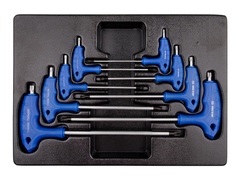 Выполнены в L-образной форме.Эргономичная форма рукояток, изготовленных из пластика, удобно располагается в руке. В процессе производства рабочие поверхности TORX KING TONY подвергаются специальной термической обработке, что придаёт им особую прочность и стойкость к износу или сколам. Инструмент размещен в ложементе № 4 (375 х 265 мм) из ПВХ изготовленном специально для инструментального бокса. В комплект входит: