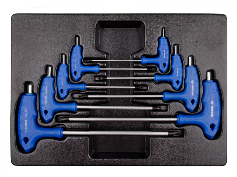 Выполнены в L-образной форме.Эргономичная форма рукояток, изготовленных из пластика, удобно располагается в руке. В процессе производства рабочие поверхности шестигранников KING TONY подвергаются специальной термической обработке, что придаёт им особую прочность и стойкость к износу или сколам. Инструмент размещен в ложементе № 4 (375 х 265 мм) из ПВХ изготовленном специально для инструментального бокса. В комплект входит: