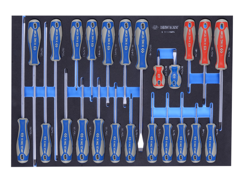 Набор отверток в ложементе из 24 предмета KING TONY 9-31124MRV применяется в автосервисе, в гараже, на промышленном предприятии.Отвертки расположены в ложементе категории № 6 (560 x 375mm) изготовленным специально для комплектации инструментальной тележки. Материал ложемента – EVA Двухкомпонентные, рукояти прямой формы эргономично располагаются в руке во время работы В комплект входит:
