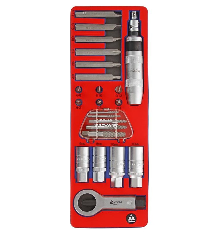 Набор инструментов МАСТАК 5-19424 содержит 24 предмета. Набор отлично подойдет для автослесарной мастерской, станции технического обслуживания или производственного цеха.Инструмент размещен в ложементе. Материал ложемента EVA (ЭВА, этиленвинилацетат). При своей лёгкости, этот материал обладает высокими прочностными характеристиками, стойкостью к маслам и растворителям, при деформации возвращает прежнюю форму. Изготовлен специально для комплектации передвижных инструментальных тележек . Инструмент изготовлен из закаленной хром-ванадиевой стали, что придает твердость и износостойкость. В комплект входит: