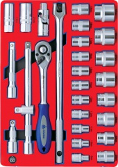 Набор фирмы МАСТАК 5-004228 с присоединительным квадратом 1/2" содержит 28 предметов. Набор отлично подойдет для автослесарной мастерской, станции технического обслуживания или производственного цеха.Инструмент размещен в ложементе. Материал ложемента EVA (ЭВА, этиленвинилацетат). При своей лёгкости, этот материал обладает высокими прочностными характеристиками, стойкостью к маслам и растворителям, при деформации возвращает прежнюю форму. Изготовлен специально для комплектации передвижных инструментальных тележек . Инструмент изготовлен из закаленной хром-ванадиевой стали, что придает твердость и износостойкость. В комплект входит: