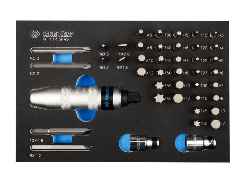 Набор фирмы KING TONY 9-4143FRV содержит 43 предмета.Отвертка ударная применяется при работах с крепежом с применением ударной нагрузки, основное назначение ударной отвертки - начальная стадия работы с крепежом. Набор расположен в ложементе категории № 7 (280 x 187 мм) изготовленным специально для комплектации инструментальной тележки. Материал ложемента EVA (ЭВА, этиленвинилацетат)