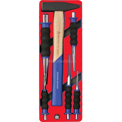 Набор ударно-режущего инструмента МАСТАК 5-9006 содержит 6 предметов. Набор отлично подойдет для автослесарной мастерской, станции технического обслуживания или производственного цеха.Инструмент размещен в ложементе. Материал ложемента EVA (ЭВА, этиленвинилацетат). При своей лёгкости, этот материал обладает высокими прочностными характеристиками, стойкостью к маслам и растворителям, при деформации возвращает прежнюю форму. Изготовлен специально для комплектации передвижных инструментальных тележек . Инструмент изготовлен из закаленной хром-ванадиевой стали, что придает твердость и износостойкость. В комплект входит: