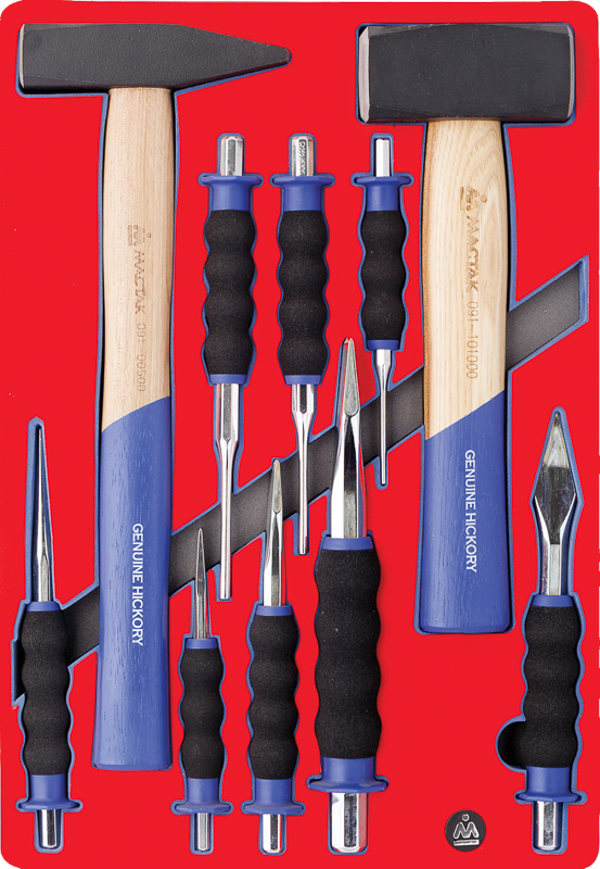 Набор ударно-режущего инструмента МАСТАК 5-9010 содержит 10 предметов. Набор отлично подойдет для автослесарной мастерской, станции технического обслуживания или производственного цеха.Инструмент размещен в ложементе. Материал ложемента EVA (ЭВА, этиленвинилацетат). При своей лёгкости, этот материал обладает высокими прочностными характеристиками, стойкостью к маслам и растворителям, при деформации возвращает прежнюю форму. Изготовлен специально для комплектации передвижных инструментальных тележек . Инструмент изготовлен из закаленной хром-ванадиевой стали, что придает твердость и износостойкость. В комплект входит: