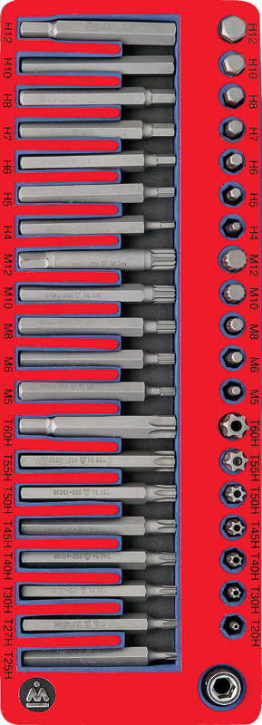 Набор вставок МАСТАК 5-5240 содержит 40 предметов. Набор отлично подойдет для автослесарной мастерской, станции технического обслуживания или производственного цеха.Инструмент размещен в ложементе. Материал ложемента EVA (ЭВА, этиленвинилацетат). При своей лёгкости, этот материал обладает высокими прочностными характеристиками, стойкостью к маслам и растворителям, при деформации возвращает прежнюю форму. Изготовлен специально для комплектации передвижных инструментальных тележек . Инструмент изготовлен из закаленной хром-ванадиевой стали, что придает твердость и износостойкость. В комплект входит: