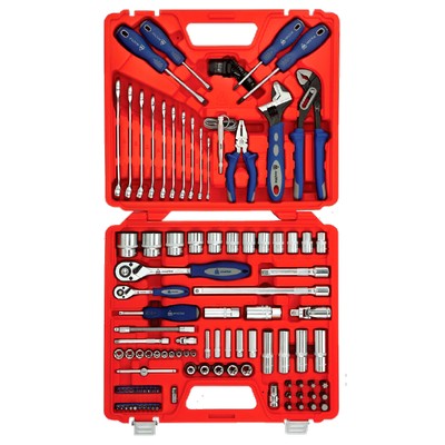 В составе набора: головки торцевые стандартные шестигранные,головки торцевые стандартные Е-тип, головки торцевые глубокие, головки торцевые шестигранные для свечей зажигания, воротки реверсивные, карданы, переходник, ключи комбинированные, плоскогубцы комбинированные, отвёртки, вставки, индикатор напряжения 6-24V