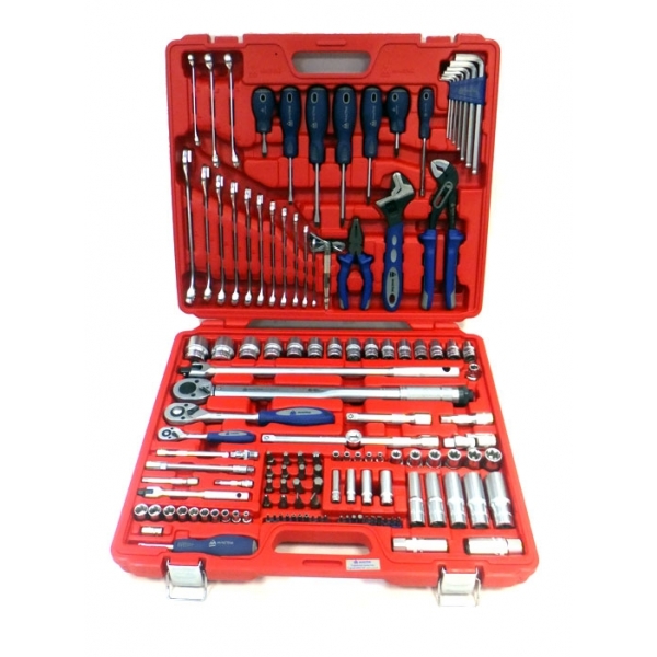 В составе набора: комплект головок торцевых стандартных шестигранных, головки стандартные E-тип, головки торцевые глубокие шестигранные, воротки реверсивные, воротки с шарниром, удлинители стандартные, карданы, ключ разводной, ключи комбинированные, ключи разводные, плоскогубцы, клещи переставные, отвёртки, вставки, шестигранники, индикатор напряжения, извлекатель магнитный телескопический.