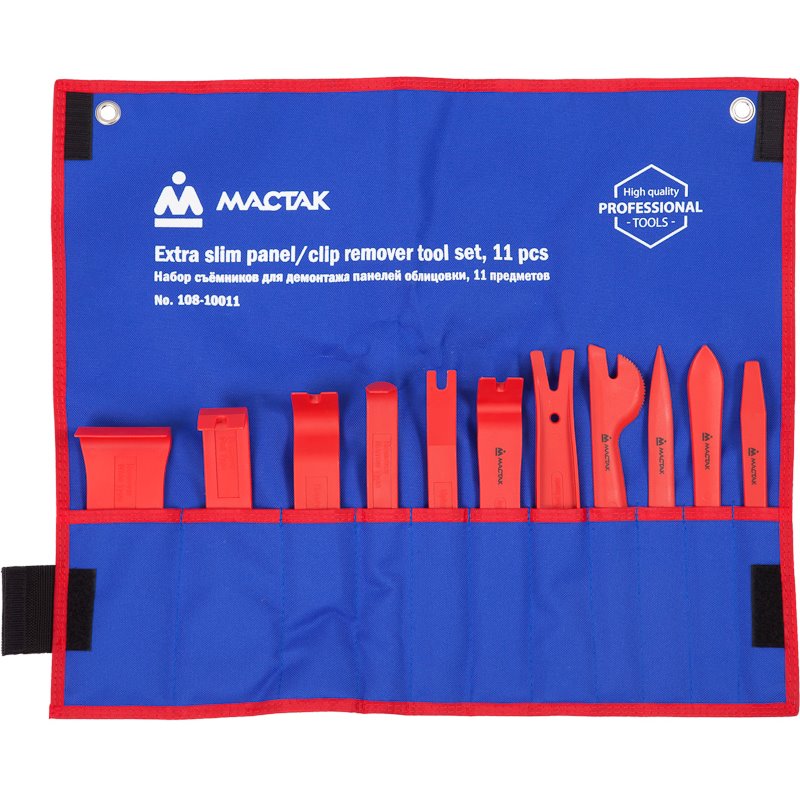 Входящие в комплект приспособления позволяют быстро и комфортно демонтировать панели салона автомобиля.В комплекте 11 предметов для различных марок автомобилей. Инструмент расположен в чехле из теторона, что делает комфортным выбор определённого инструмента в процессе работы. Чехол удобен для хранения и транспортировки, а также предохраняет от утери. Специальные проушины в чехле предназначены для вывешивания набора на рабочем месте - на стене, специальном инструментальном. стенде, верстаке и др.