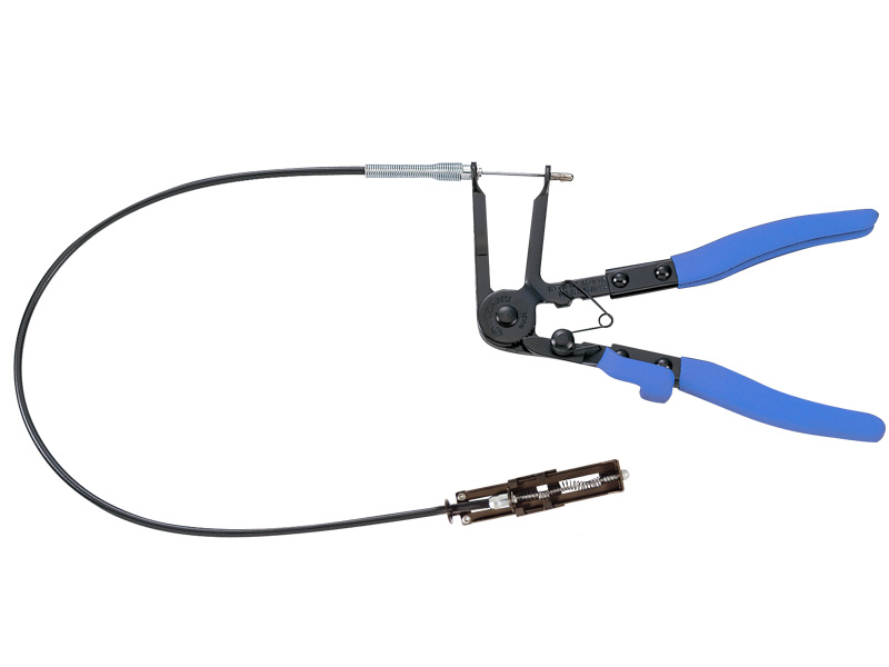 Щипцы предназначены для демонтажа топливных, масляных шлангов, шлангов с охлаждающей жидкостью, фиксированных с помощью многоразовых пружинных хомутов.Гибкий привод (длиной 630 мм) обеспечивает доступ к самым труднодоступным хомутам.. Трещоточный механизм с 5-ю положениями позволяет зафиксировать хомут в разжатом состоянии. Эргономичные прорезиненные рукоятки для надежного расположения в руке. Подходят для хомутов шлангов, топливных фильтров, помп, ШРУСов.