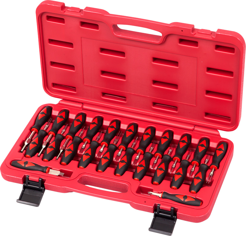 Набор для демонтажа клемм электропроводки МАСТАК 106-20001C из 23 предметов . Предназначен для бережного демонтажа контактов (плоских, круглых и др.) из разъёмов. Экстракторы, входящие в комплект набора, служат для разблокировки замков контактов в электрических разъёмах.Инструмент расположен в пластиковом кейсе для комфортного хранения и транспортировки. Набор позволяет проводить работы практически со всеми разъёмами, используемыми на легковых, грузовых автомобилях и автобусах. Применяется в автосервисе в качестве профессионального гаражного инструмента.