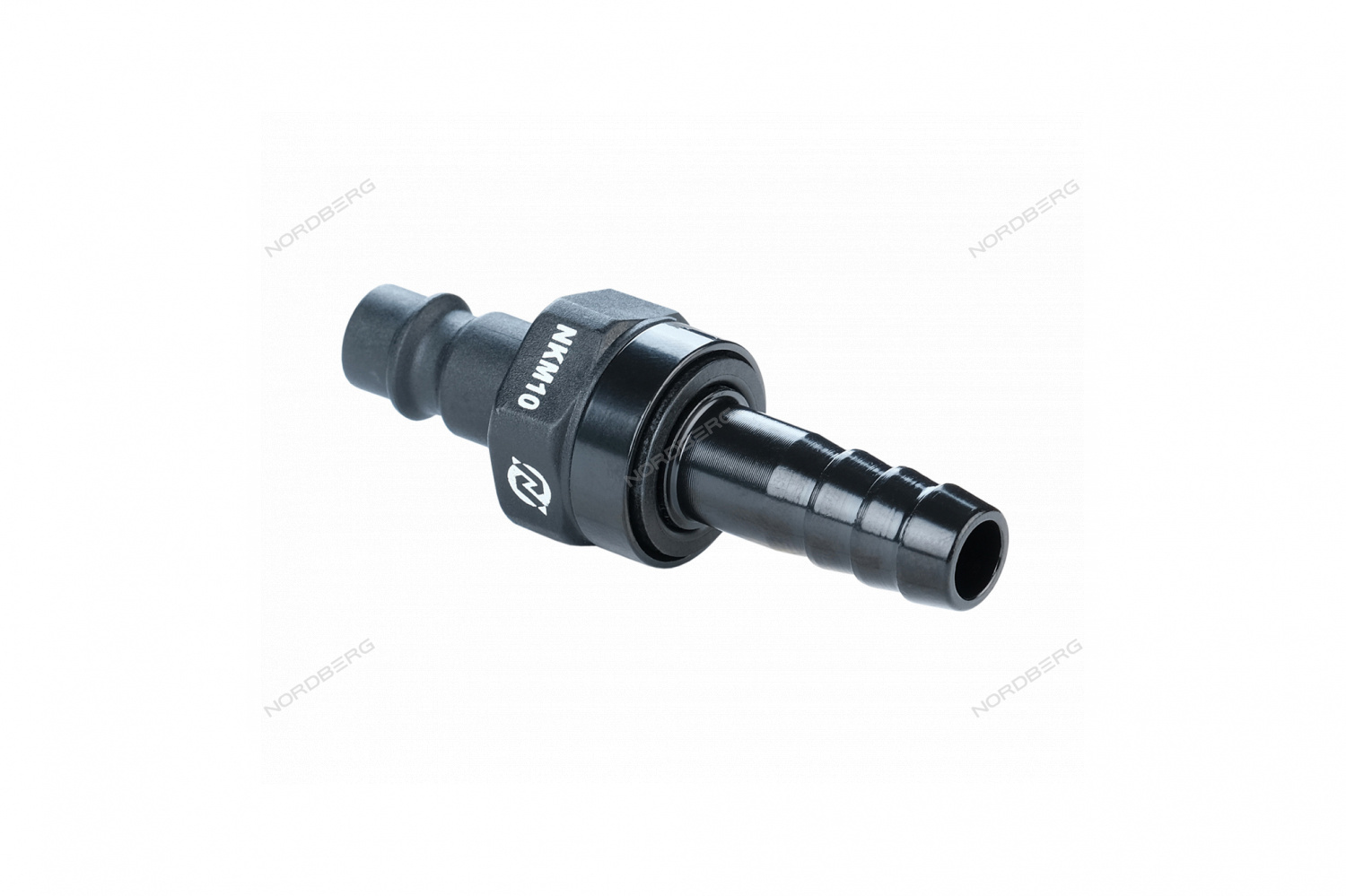 Переходник композитный NORDBERG NKM10 быстросъемный "папа" - елочка D 10 мм предназначен для соединения элементов пневмолинии и пневматического инструмента, там, где требуется частая и быстрая замена пневмоинструмента.