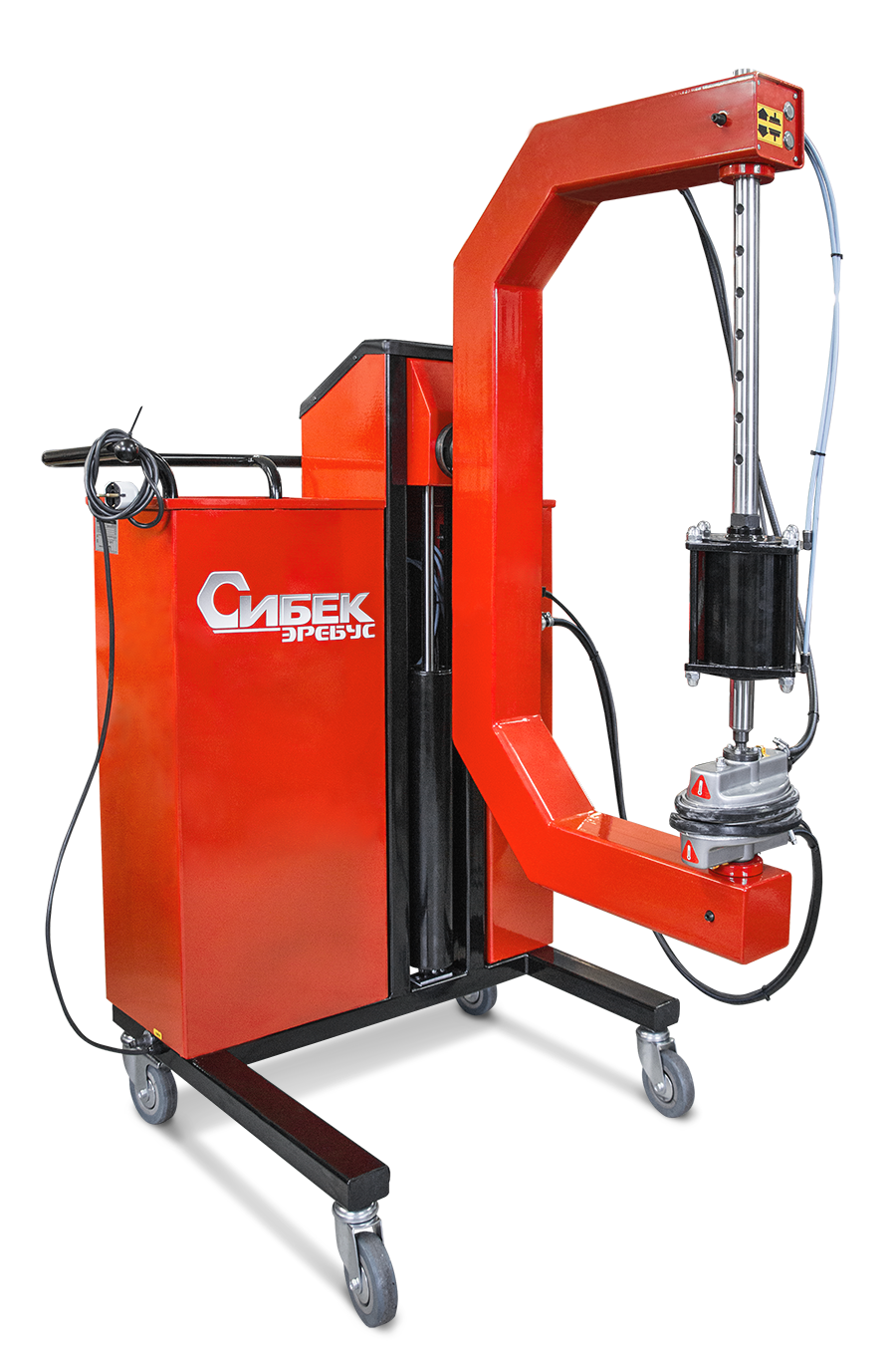 Четыре колеса облегчают лёгкий подвод вулканизатора к ремонтируемой зоне. Конструкция корпусной скобы вулканизатора «Эребус» допускает работу как в вертикальном, так и горизонтальном положении, а пневмолифт обеспечивают четкую установку прижимов на ремонтируемый участок покрышки без излишних физических усилий со стороны специалиста по ремонту, соответственно сокращая время установки покрышки на вулканизатор и продолжительность рабочего цикла.